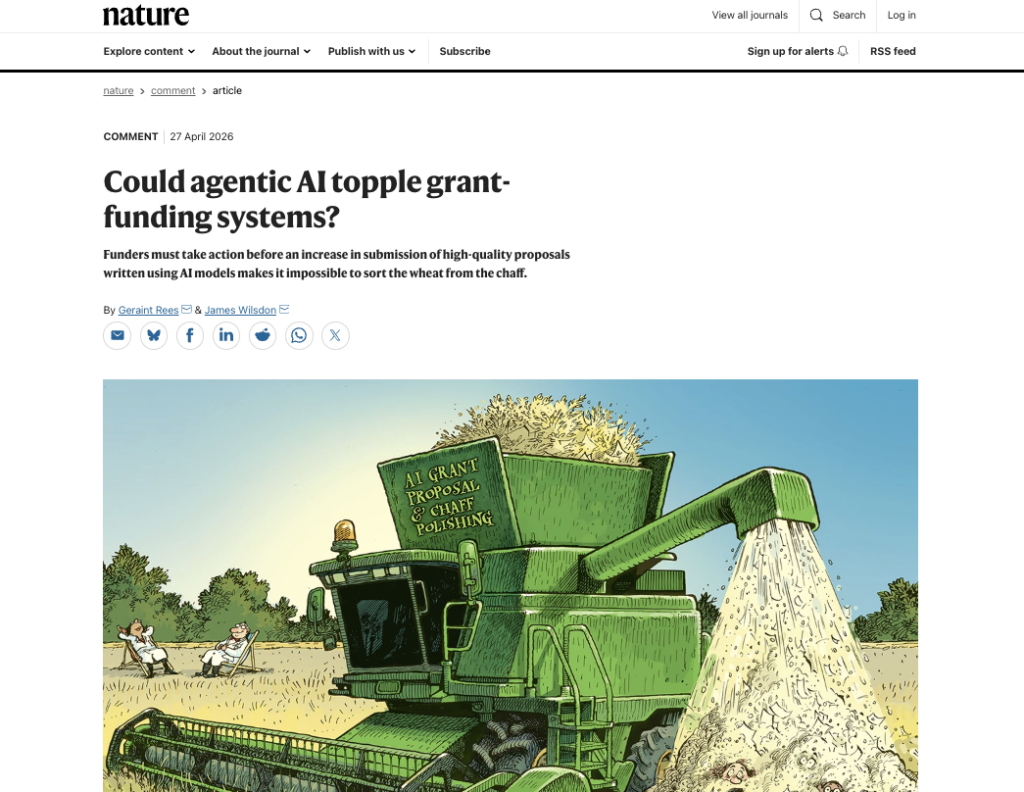 “Meanwhile, peer reviewers will be using the same agentic tools to assess proposals – so we quickly reach a point where systems of grant funding and review will collapse, unless funders adopt new strategies for managing volume and demand, and for assessing quality.”